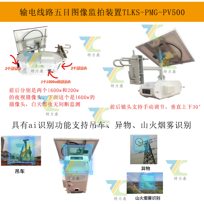 我司研發的TLKS-PMG-PV500,是一款專為輸電線路設計的五目圖像監拍裝置。在電力系統中,輸電線路常面臨外部因素導致的潛在威脅,如施工車輛誤觸、塔基損壞等。傳統監拍裝置視野受限,難以全面監控。TLKS-PMG-PV500通過前后各配置兩個攝像機及下方一個攝像機,實現了360°無死角監控,有效解決了這一問題。