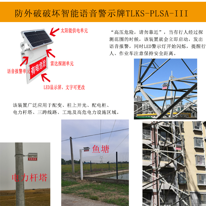 TLKS-PLSA-III線(xiàn)路防外力破壞智能警示牌廣泛適用于配變、柱上開(kāi)關(guān)、配電柜、電力桿塔、三跨線(xiàn)路、工地及高危電力設(shè)施區(qū)域,為這些關(guān)鍵區(qū)域提供強(qiáng)有力的安全保障。