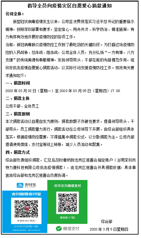 在公司層領(lǐng)導(dǎo)的帶領(lǐng)下,特力康人員紛紛解囊,小到幾十上百,大到數(shù)千,錢不分多寡,截止3月6日,結(jié)合特力康公積金捐助,共計(jì)捐款十萬(wàn)元整。這都是特力康人在力所能及范圍內(nèi)對(duì)抗擊疫情的默默支持,是對(duì)有困難群眾的守望相助。充分發(fā)揚(yáng)團(tuán)結(jié)互助精神,攜手并肩,眾志成城,凝聚起抗擊疫情的堅(jiān)定信心和強(qiáng)大力量,用另一種方式陪伴一線抗疫醫(yī)務(wù)人員和疫情患者一起戰(zhàn)勝病魔。