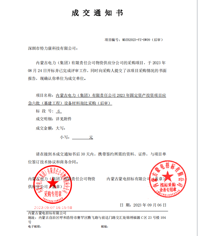 內蒙古電力(集團)有限責任公司物資供應分公司的采購項目,于2023年08月24日開標并已完成評審工作,同時向采購人提交了該項目采購情況的書面報告,現確認我單位為成交單位,中標通知如下:
