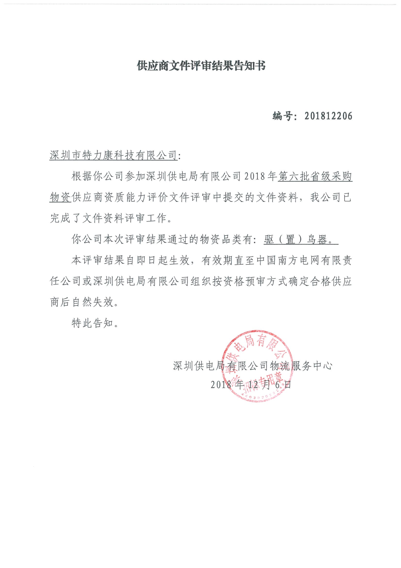 南方電網(wǎng)深圳供電有限公司2018年第六批驅(qū)(置)鳥器框架項目評審工作已結(jié)束,經(jīng)評審委員會評審,經(jīng)南網(wǎng)深圳電力公司招投標領導小組批準,我司被確定為此次驅(qū)(置)鳥器框架中標單位現(xiàn)將公告公示。
