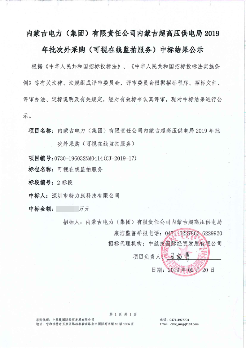 經(jīng)審委員會根據(jù)招標(biāo)程標(biāo)次評審、定標(biāo)說明及有關(guān)規(guī)定,經(jīng)對有效標(biāo)書認(rèn)真評審,確定我司為內(nèi)蒙古電力(集團(tuán))有限責(zé)任公司內(nèi)蒙古超高壓供電局2019年批次外采購(可視在線監(jiān)測服務(wù))項(xiàng)目中標(biāo)單位。