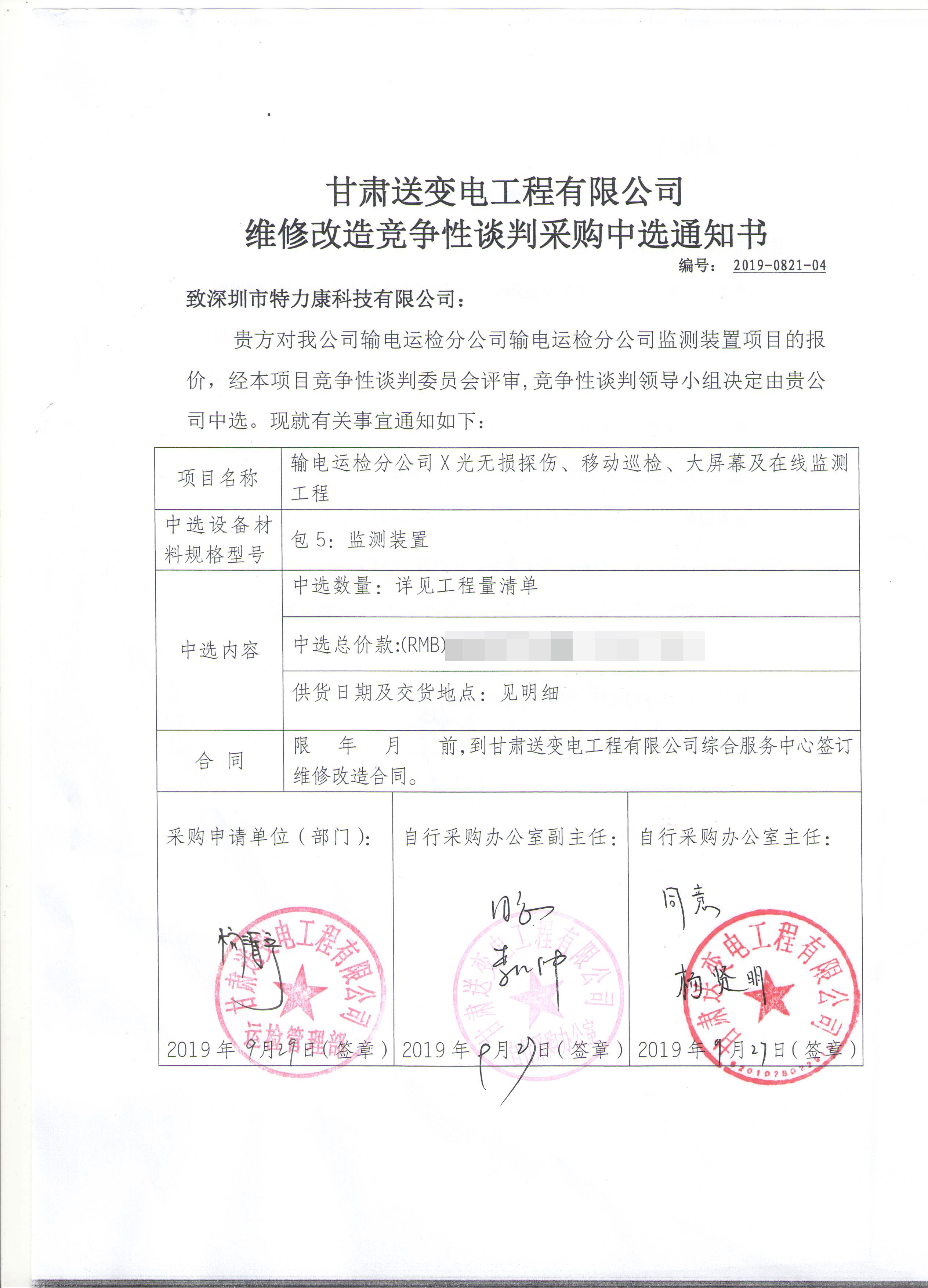 經審委員會根據招標程標次評審、對有效標書認真評審,競爭性談判領導小組確定我司為甘肅送變電工程有限公司維修改造競爭性談判采購項目中標單位。