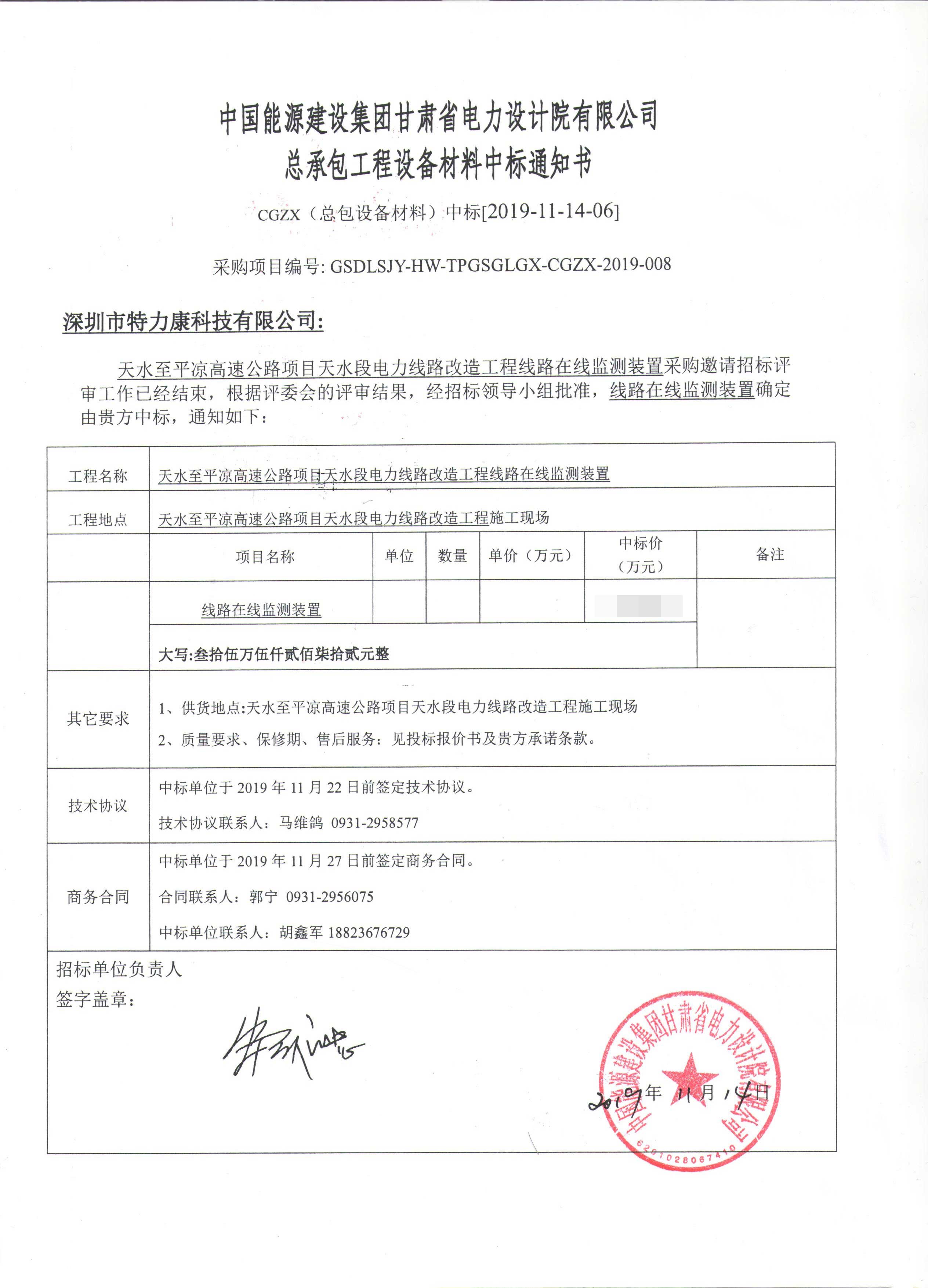 國(guó)網(wǎng)甘肅天水段電力線路改造工程線路在線監(jiān)測(cè)采購(gòu)招標(biāo)評(píng)審工作已經(jīng)結(jié)束,根據(jù)評(píng)審委員會(huì)評(píng)審結(jié)果,招投標(biāo)領(lǐng)導(dǎo)小組批準(zhǔn),確定此次輸電線路在線監(jiān)測(cè)裝置由我司深圳市特力康科技有限公司中標(biāo),現(xiàn)將公告示下: