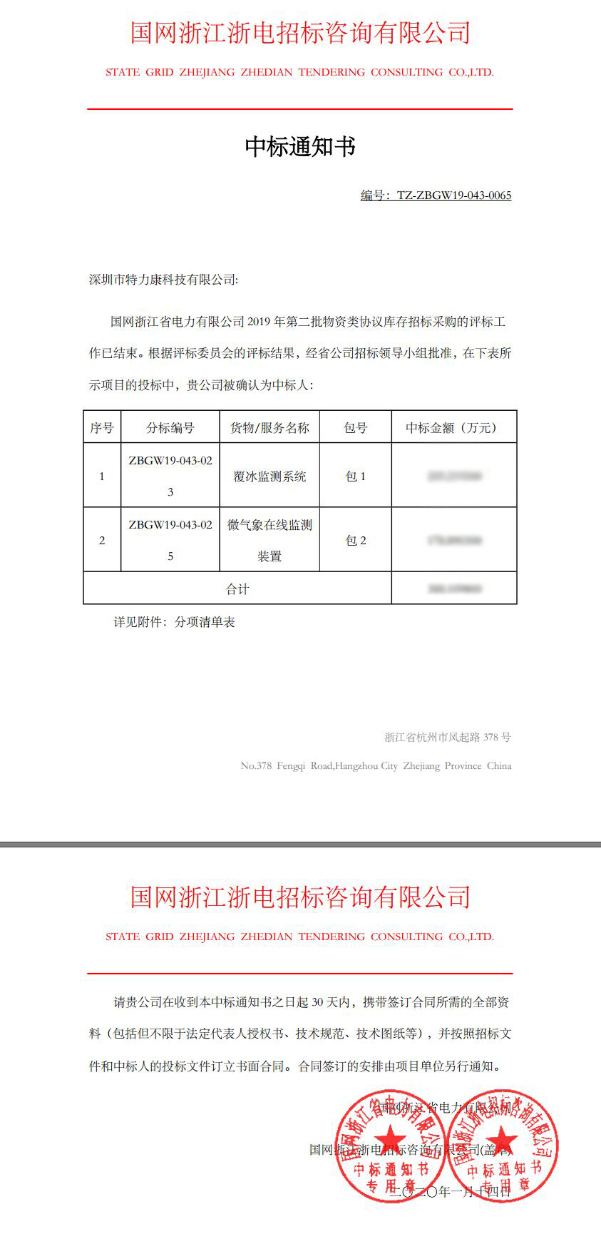 國網(wǎng)浙江省電力有限公司2019年第二批物資類協(xié)議庫存招標采購的評標工作已結束。根據(jù)評標委員會的評標結果,經(jīng)省公司招標領導小組批準,我司(深圳市特力康科技有限公司)中標ZBGW19-043-023覆冰監(jiān)測系統(tǒng)包1及ZBGW19-043-025微氣象在線監(jiān)測包2兩個標包,現(xiàn)附中標通知書如下: