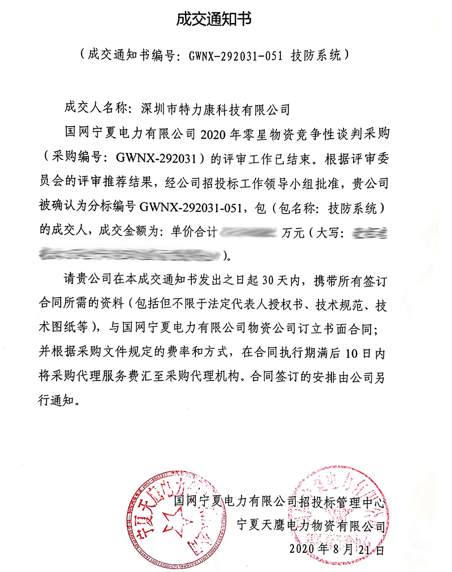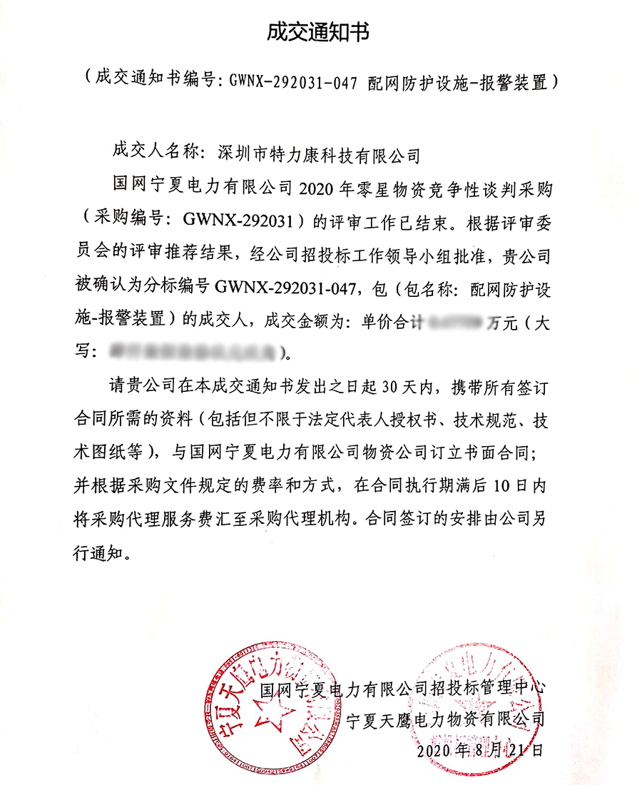 國網寧夏電力有限公司2020年零星物資競爭性談判采購(采購編號: GWNX-292031)的評審工作已結束。根據評審委員會的評審推薦結果,經招投標工作領導小組批準,我司(深圳市特力康科技有限公司)被確認為分標編號GWNX-292031-047,包(包名稱:配網防護設施-報警裝置)及分標編號GWNX-292031-051,包(包名稱:技防系統)的成交人,現發布成交通知書如下: