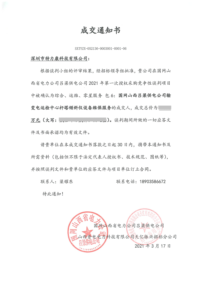 根據(jù)談判小組的評審結(jié)果,經(jīng)招標領(lǐng)導組批準,貴公司在國網(wǎng)山西省電力公司呂梁供電公司2021年第一次授權(quán)采購競爭性談判項目中被確認為綜合、運維、零星服務包6:國網(wǎng)山西呂梁供電公司輸變電運檢中心桿塔傾斜儀設備維保服務的成交人,成交通知如下: