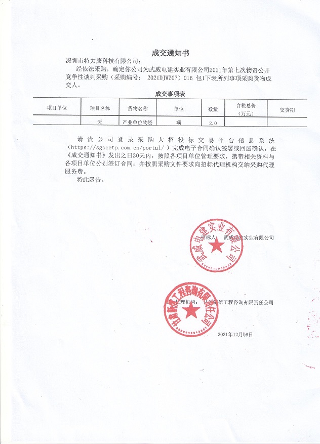 經依法采購,確定我司為武威電建實業有限公司2021年第七次物資公開競爭性談判采購(采購編號: 2021DJWZ07) 016包I下表所列事項采購貨物成交人。成交通知如下: