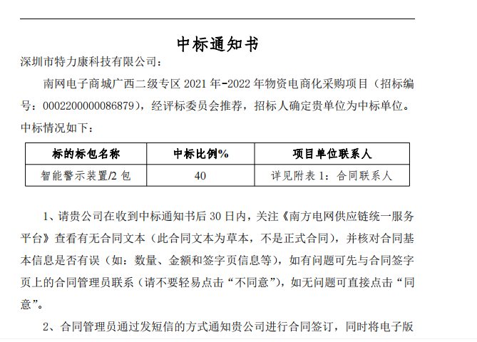 我司中標南網電子商城廣西二級專區2021年-2022年物資電商化采購項目(招標編號: 0020000086879) - 智能警示裝置,經評標委員會推薦,招標人確定我單位為中標單位。中標情況如下: