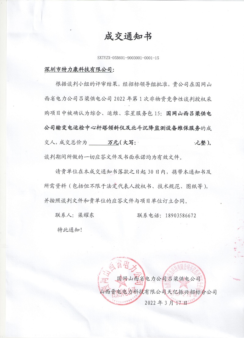 根據談判小組的評審結果,經招標領導組批準,我司在國網山西省電力公司呂梁供電公司2022年第1次非物資競爭性談判授權采購項目中被確認為綜合、運維、零星服務包15:國網山西呂梁供電公司輸變電運檢中心桿塔傾斜儀及北斗沉降監測設備維保服務的成交人,成交通知如下: